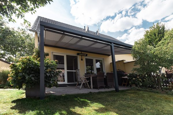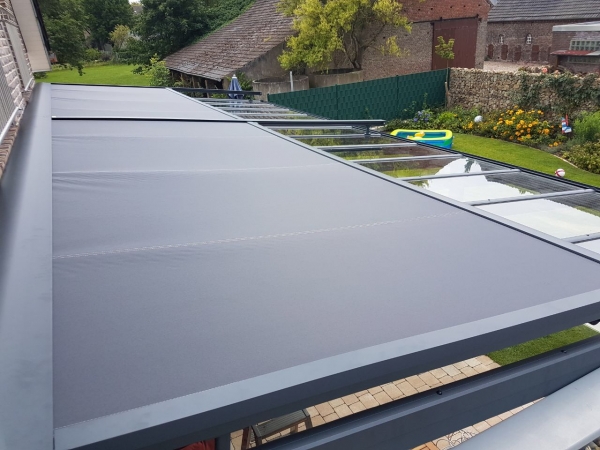 Eine Aufdachmarkise wird, wie der Name bereits verrät, auf dem Terrassendach montiert. Durch die Montage außerhalb des Daches gelangen keine Sonnenstrahlen in deinen Glasgarten. Somit heizt sich dein Glasgarten langsamer auf.