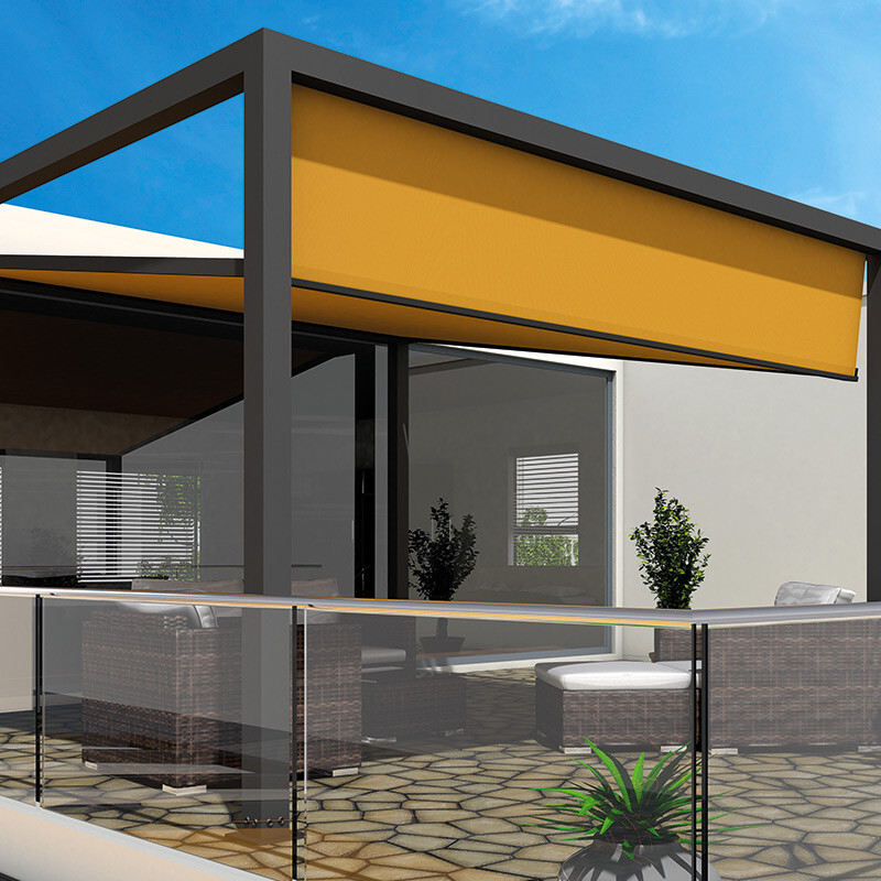 Das z. B. von Nova Hüppe entwickelte System Q.bus vereint hochwertiges Design mit unbegrenzten Einsatzmöglichkeiten, sowohl als freistehende Variante als auch mit Hausanschluss. Durch die flexible Dachkonstruktion, ist eine Nutzungung sogar bei Regen möglich. Der Q.bus kann sowohl mit einer horizontale Dachmarkise, als auch mit einer Senkrechtmarkise ausgestattet werden. Alle Markisen können entsprechend der Sonnen- und Windverhältnisse per Funkfernbedienung ausgerichtet werden.