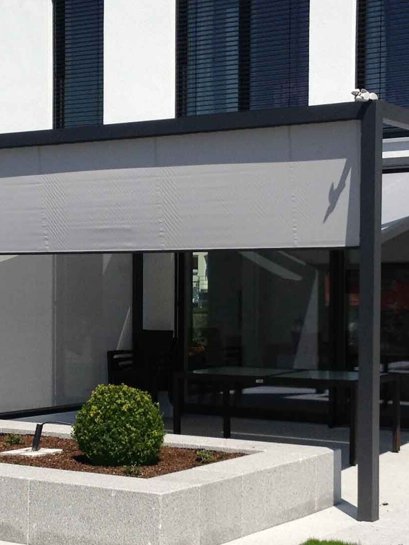 Unsere außergewöhnlichen Beschattungssysteme erfüllen höchste Designansprüche und passen ideal zu moderner Architektur. Sie ermöglichen eine enorme Vielfalt an Beschattungsvarianten – ob privat genutzt oder in der Gastronomie, freistehend oder an eine Fassade montiert. Sie sind ebenso beliebig erweiterbar für Ecklösungen und andere Formen. Die Anlagen werden durch Elektromotoren – wahlweise per Funk – gesteuert.