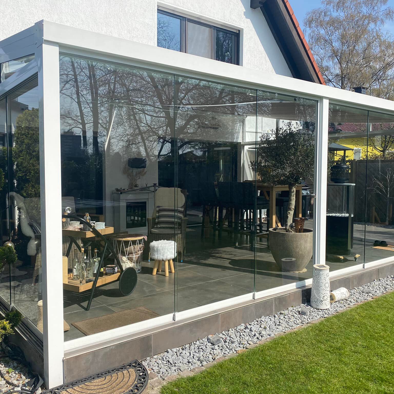 Erleben Sie das Wintergarten Ambiente. Verschließen Sie Ihre Terrassenüberdachung mit Seitenwänden, Schiebetüren oder Fenstereinheiten und verlängern die Sommerzeit und bewahren ebenso Ihre Einrichtung. Ihr bevorzugter Ort ist somit stets direkt und ohne ärgerliches Entfernen von Feuchtigkeit verfügbar. Wie ein Wohnraum im Garten.