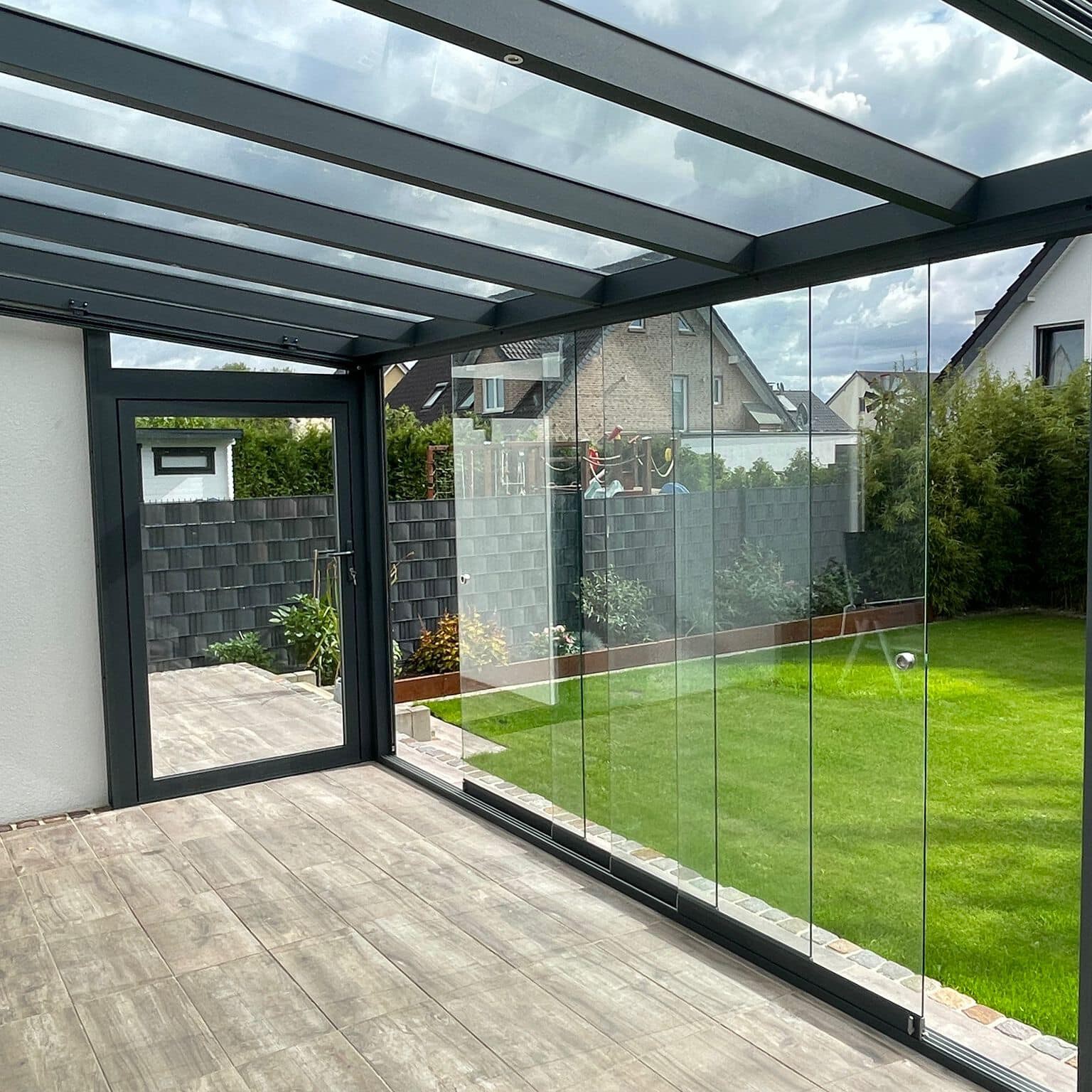 Sofern Sie einen optimalen Schutz für Ihre Außenterrasse erreichen möchten, lässt sich jedes Terrassendach von uns durch eine variable Verglasung an den offenen Seiten ergänzen. Durch entsprechende Ganzglas-Schiebetüren schirmen Sie sich somit rundherum auch vor Wind und Regenwasser ab und erhalten einen geschlossenen Raum, der Ihre Terrassenüberdachung zu einem vollständigen Sommergarten erweitert. Die Entscheidung hierfür kann jederzeit – auch nachträglich – getroffen werden und muss nicht bei der ersten Planung Ihrer Terrassenbedachung berücksichtigt werden. Lassen Sie sich hier inspirieren und fragen Sie gerne Ihren persönlichen Preis an.